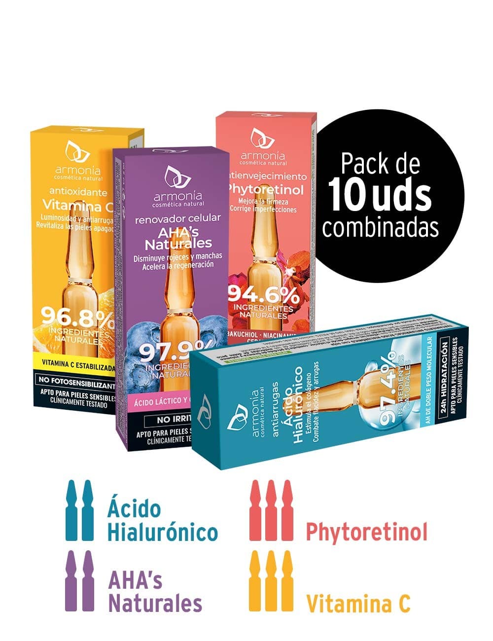 Pack for a 10-day anti-blemish and renewal plan with 3 Vitamin C ampoules, 3 Phytoretinol ampoules, 2 Hyaluronic Acid ampoules and 2 Natural AHA's ampoules.